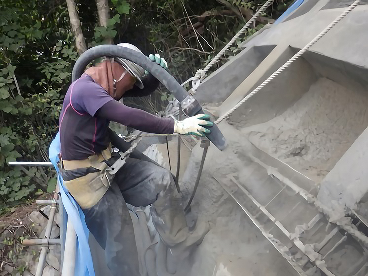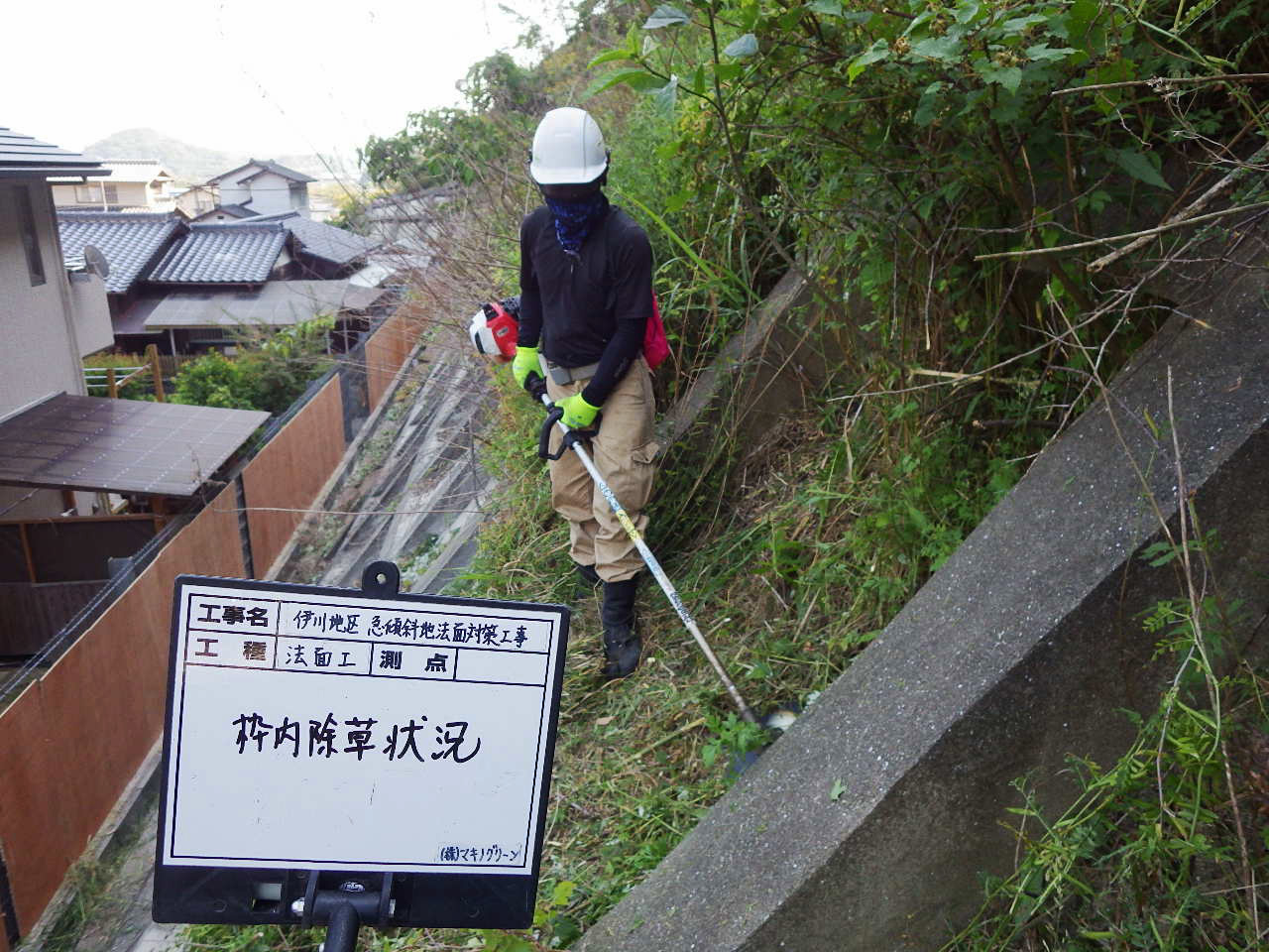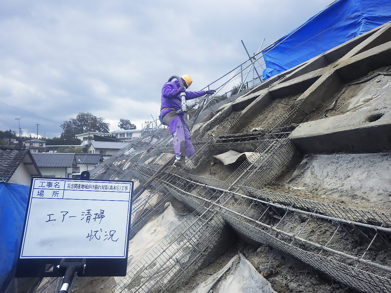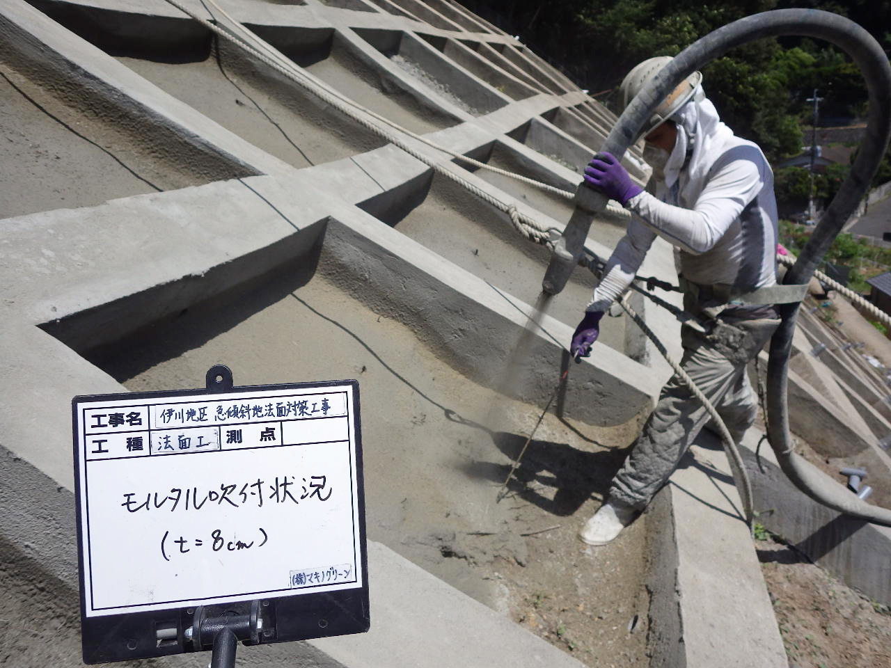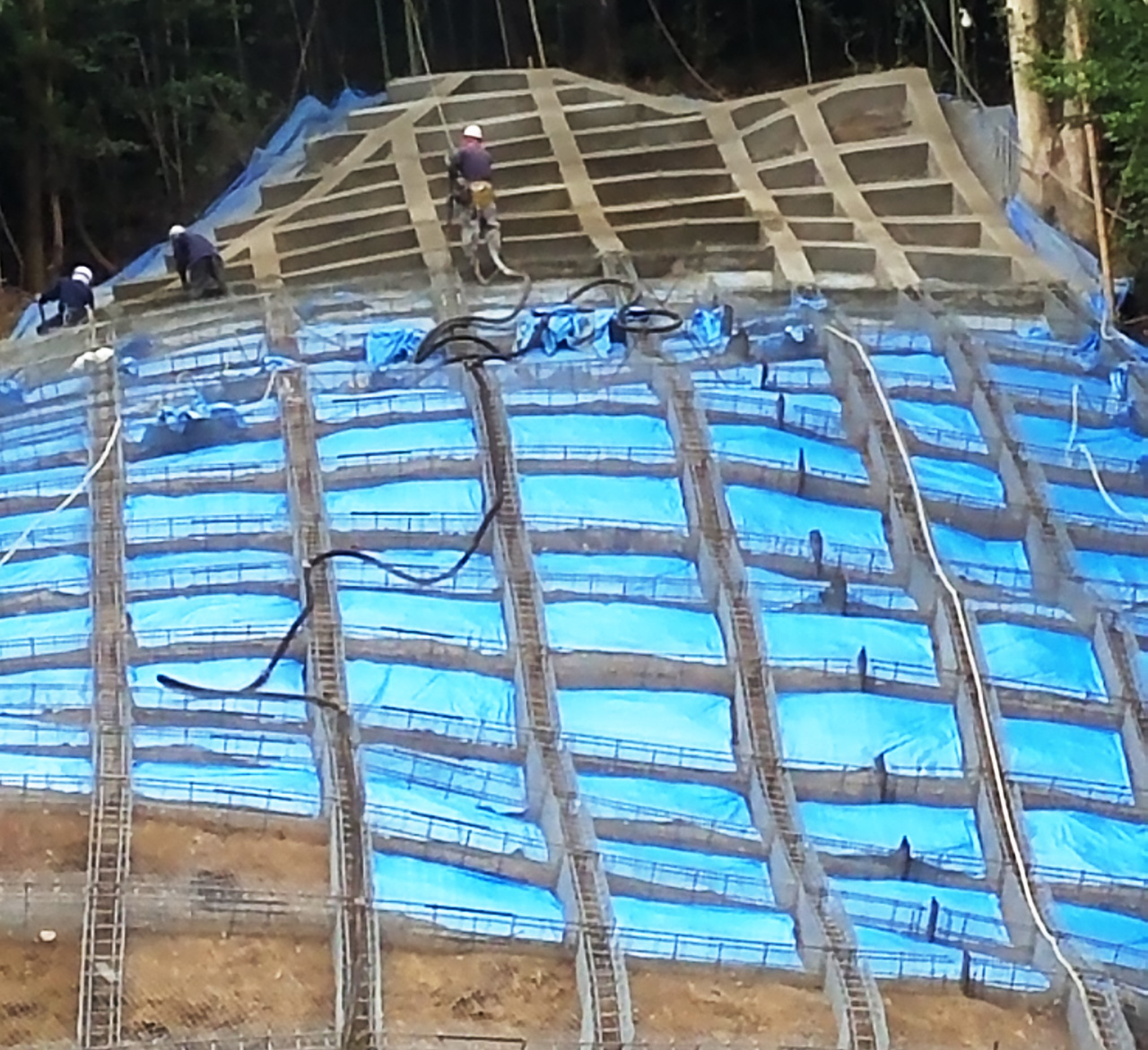 | 内容 | 吹付法枠工300×300×2000 2,591㎡ 枠内植生工、最下段枠内モルタル吹付工 県道沿いの6段法面を坂巻により施工。 |