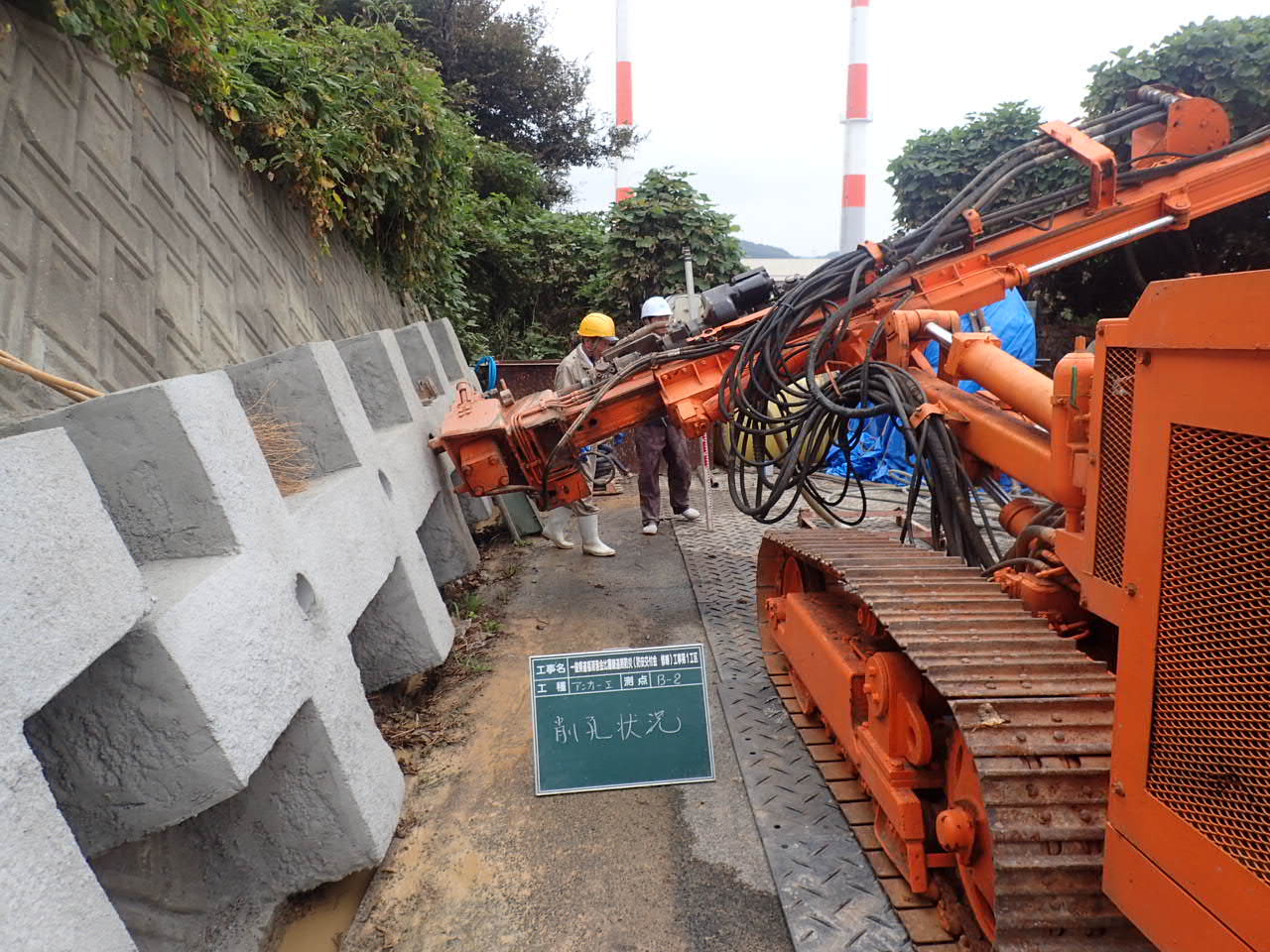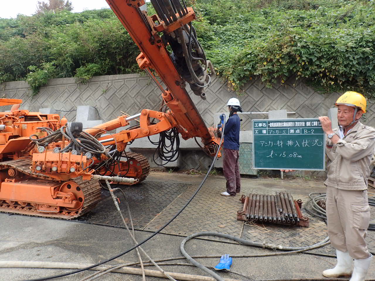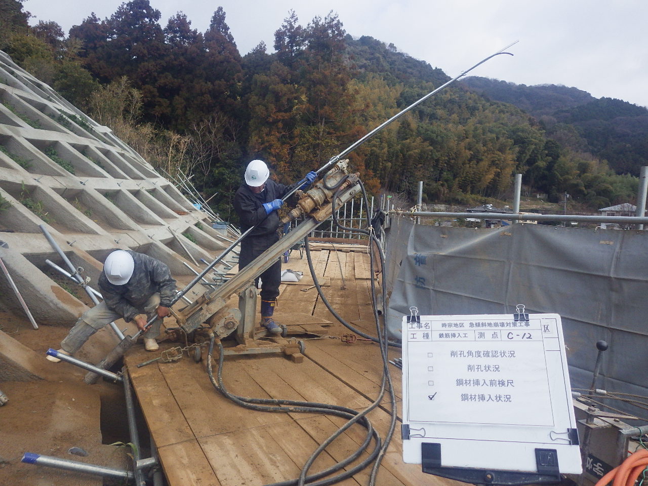 | 内容 | 土砂災害警戒区域に指定されている時宗地区において、立案されている吹付法枠工+鉄筋挿入工を施工しました。基本試験(引抜き試験)を行い、土質定数(周面摩擦抵抗値)の確認も行いました。 |