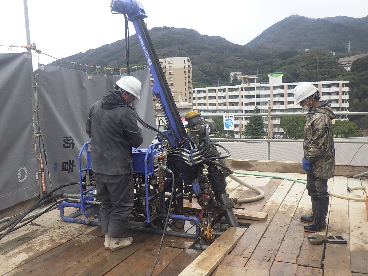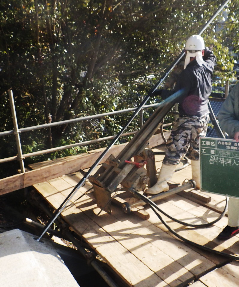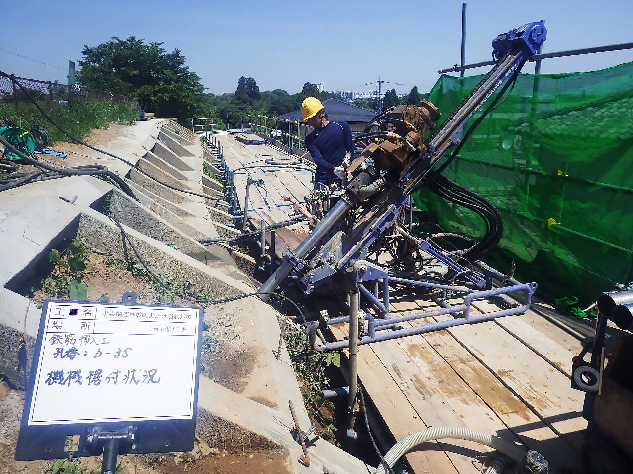 | 内容 | 土砂災害警戒区域に指定されている時宗地区において、立案されている吹付法枠工+鉄筋挿入工を施工しました。基本試験(引抜き試験)を行い、土質定数(周面摩擦抵抗値)の確認も行いました。 |