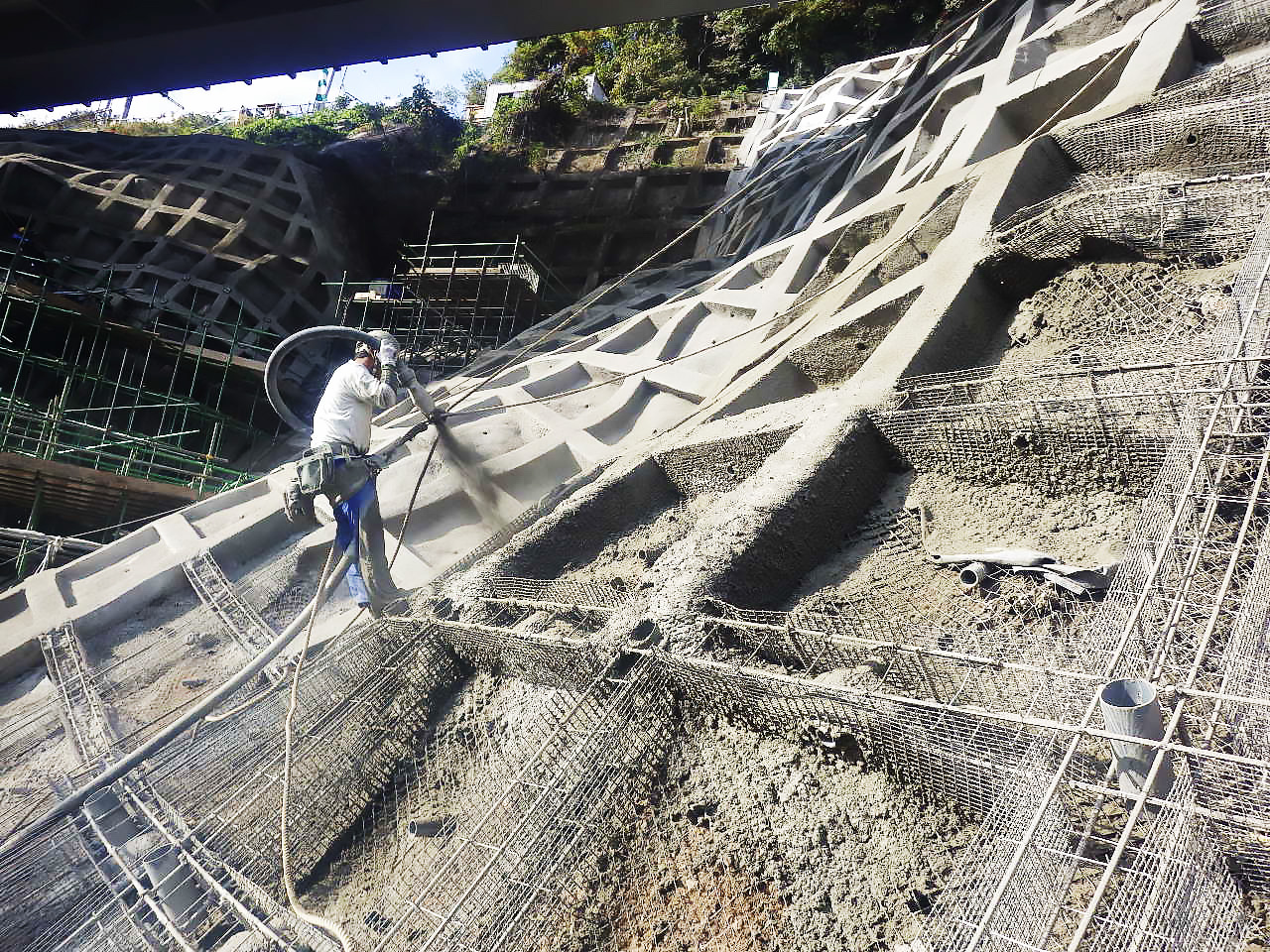 | 内容 | 平成28年度熊本地震による補強工事で、橋脚周辺の斜面を吹付法枠工と鉄筋挿入工で施工しました。 *吹付法枠工 H300…914m *鉄筋挿入工…570.8m |
