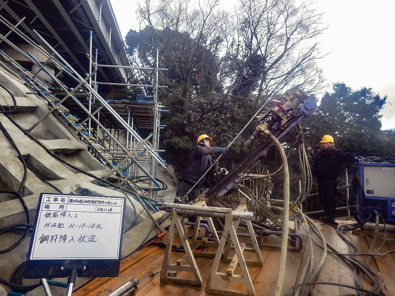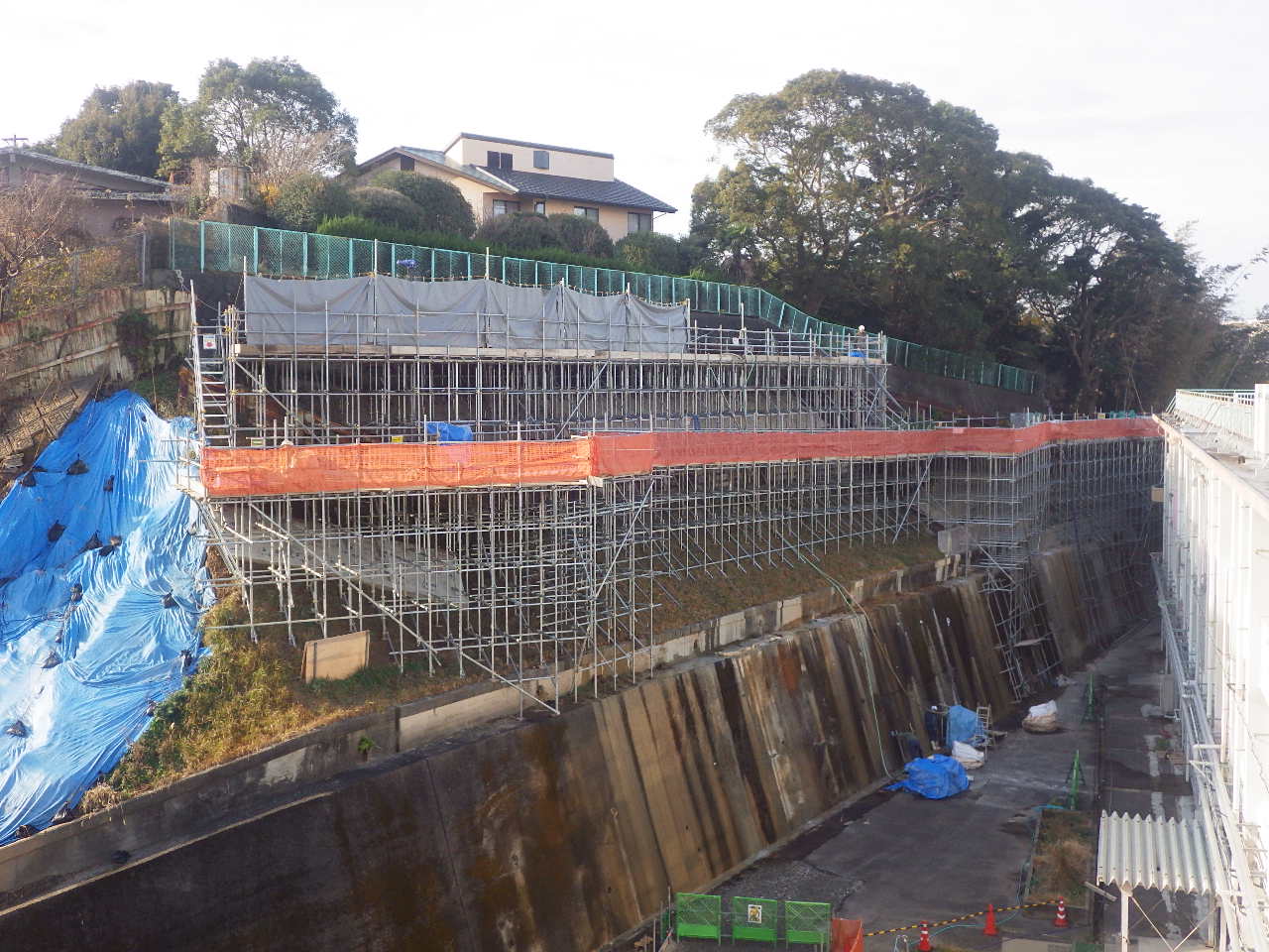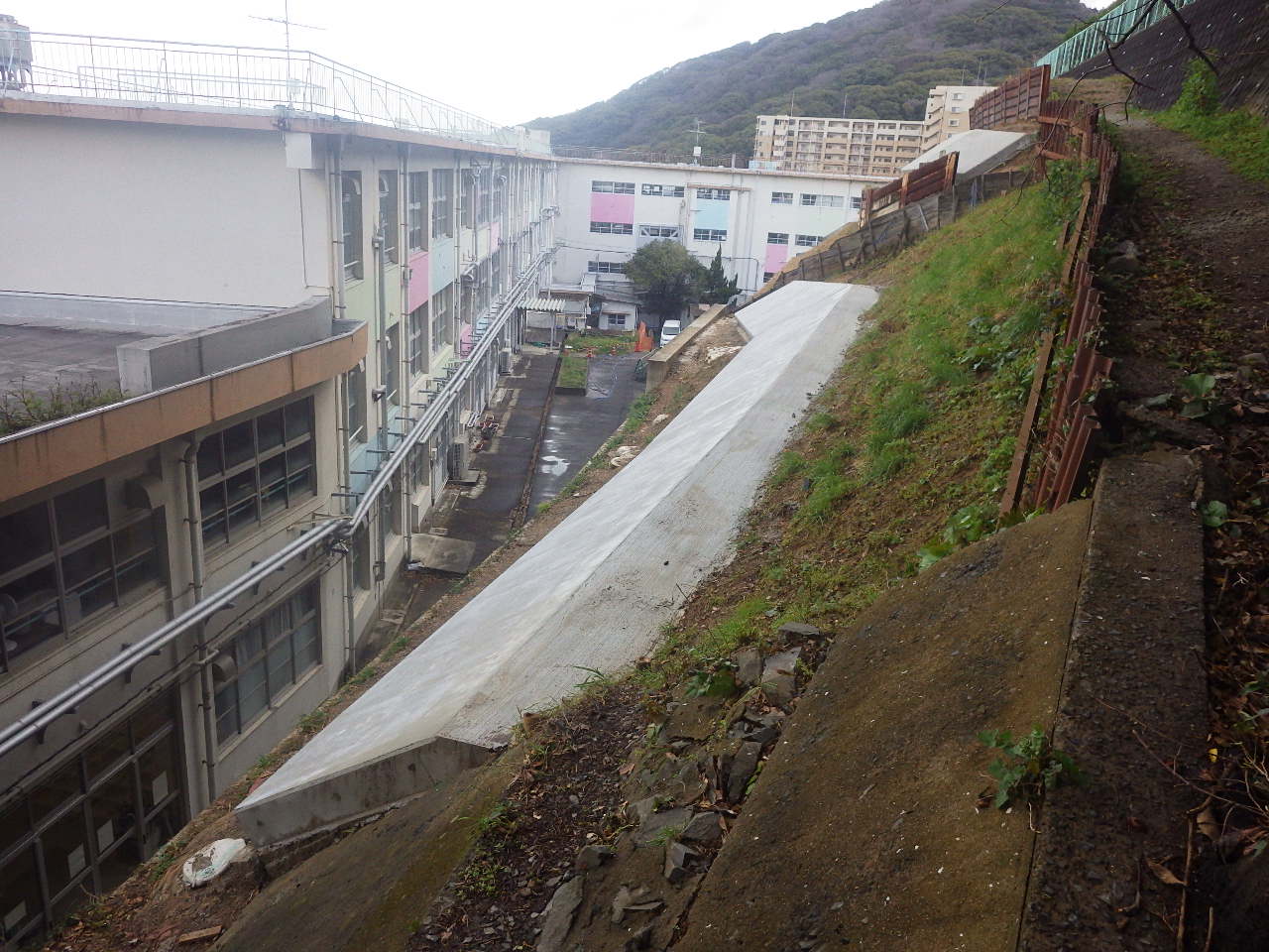 | 内容 | 平成30年に突発的な豪雨に見舞われ、小学校校舎内の法面に地滑りの兆候が見られた為、抑止工(ルートパイル工法)を行った。 *ルートパイル工…4.0m~12.5m(238本) *足場工…1238空㎥ |