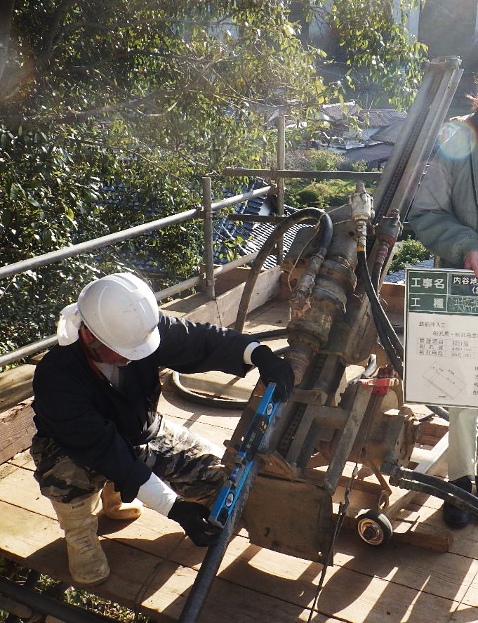| 内容 | 集水井工を施工後、井戸内に削孔機を設置して水抜ボーリングを施工します。 |