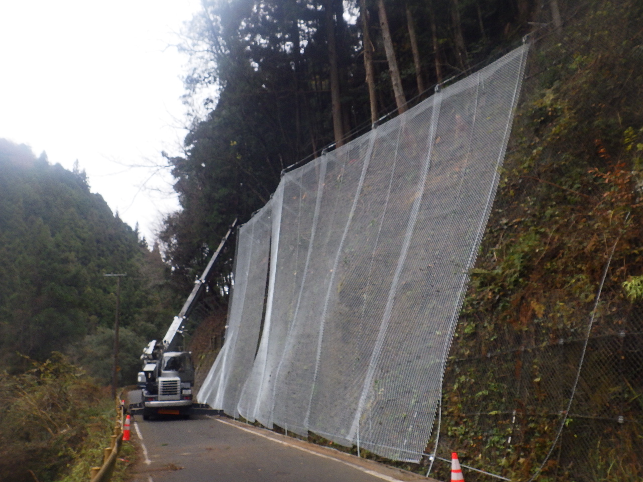 | 内容 | 主要県道周東美川線において、落石・雪害を防止する事を目的とされた工事です。 (落石防止網工 750㎡) |