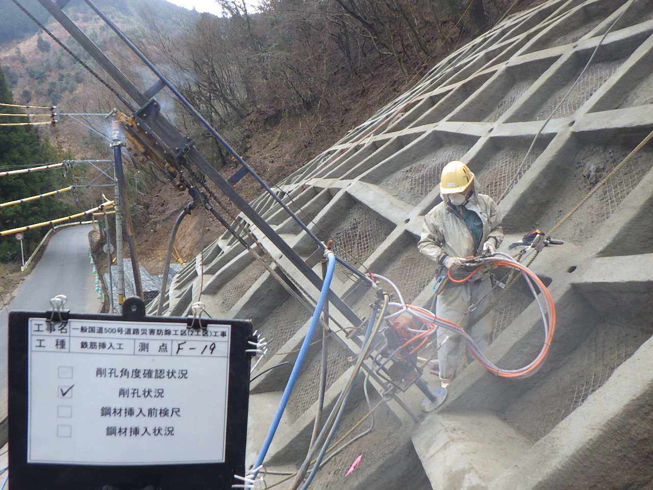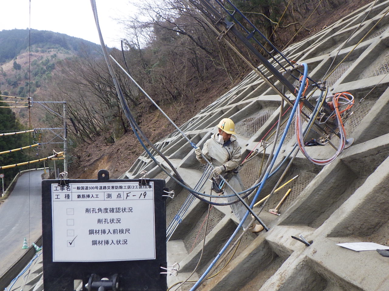 | 内容 | 国道500号朝倉地区の道路防災工事で無足場工法による鉄筋挿入工の工事。 工事内容:鉄筋挿入工・219本、削孔長・700.8m |