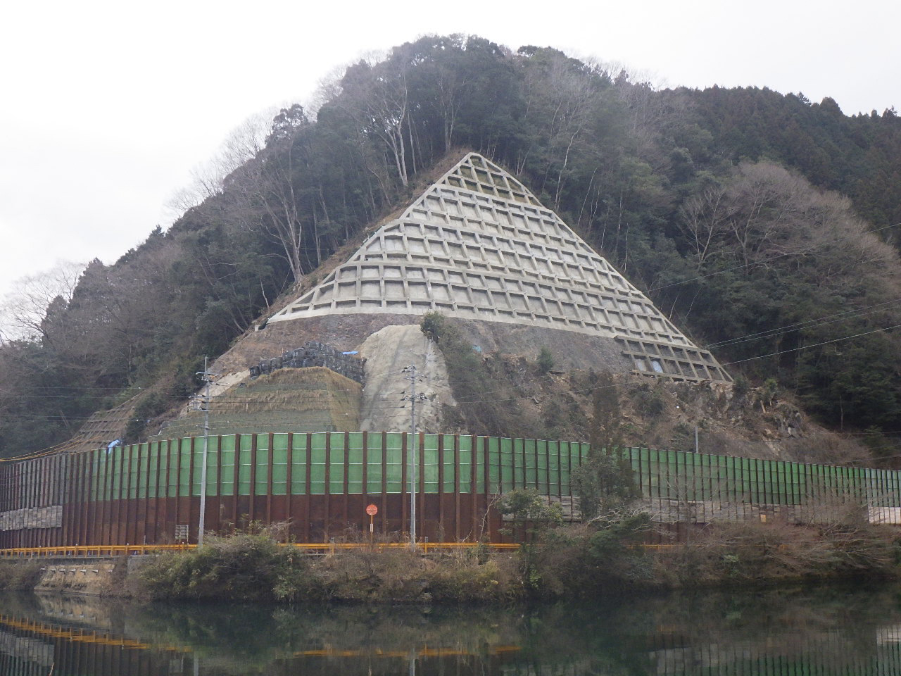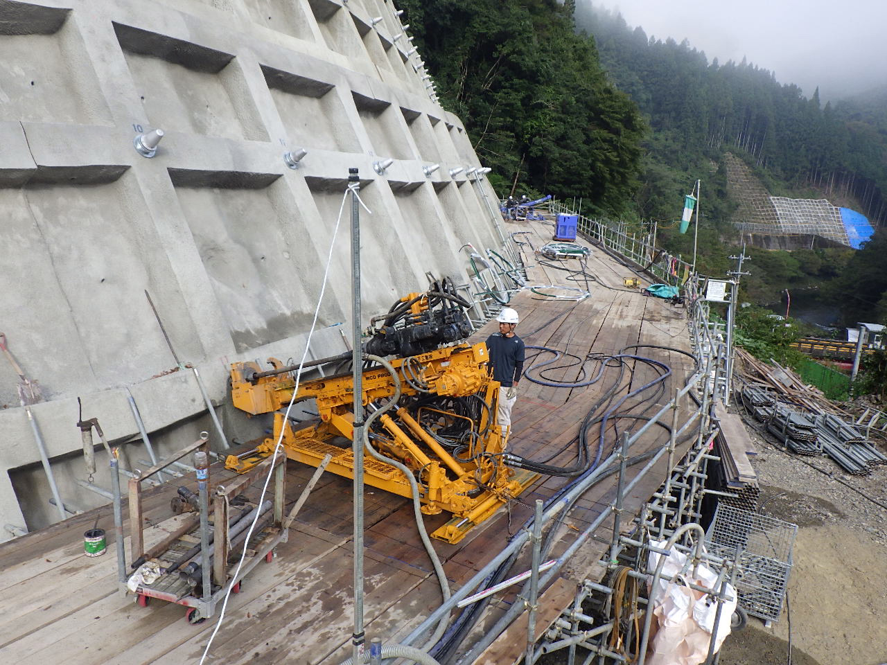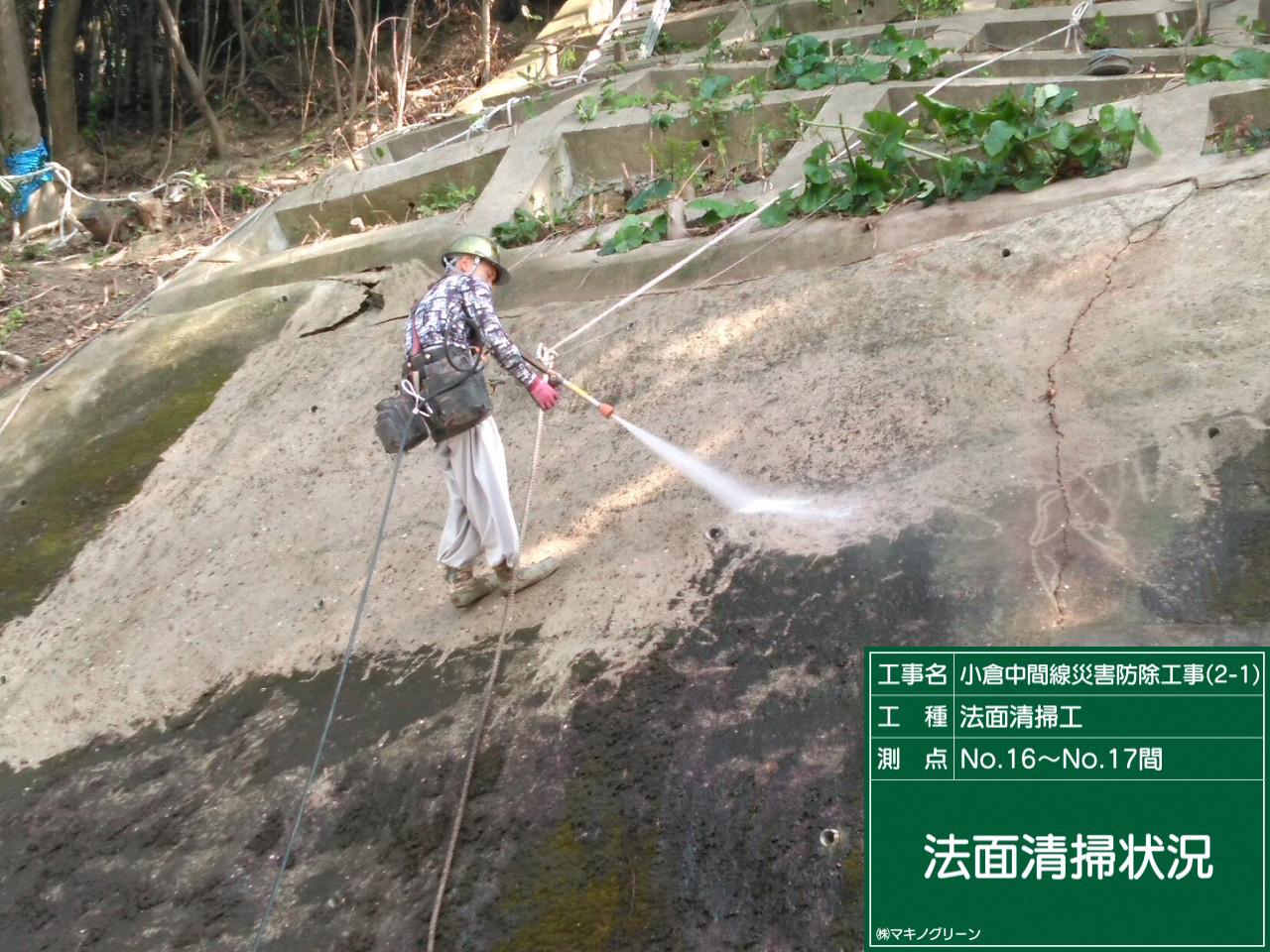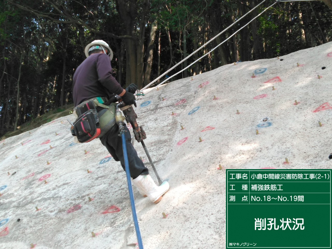 | 内容 | 法枠工500 L=925m、枠内モルタル吹付、小段モルタル吹付 アンカー工 SFL-2 7.5~9.0m 111本 県道沿いの8段法面のうち4・3段目を逆巻により施工。 |