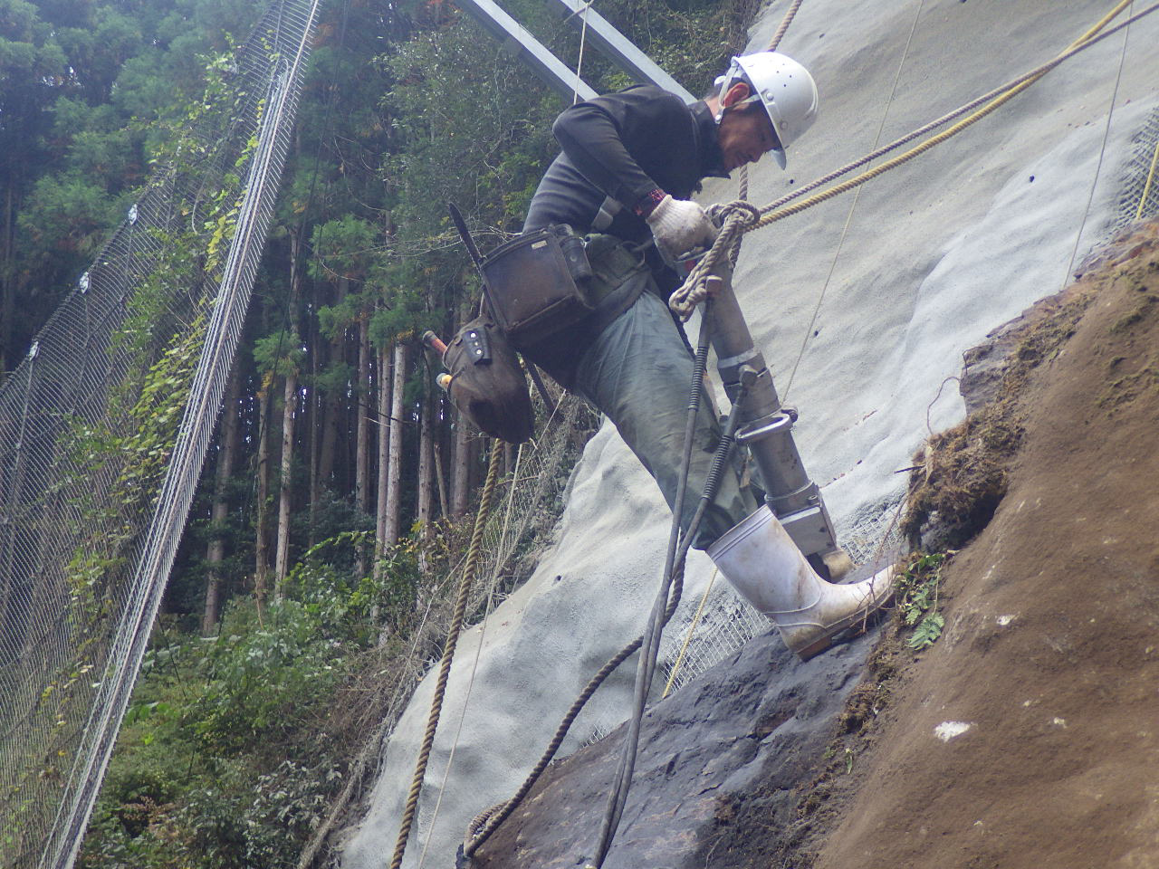| 内容 | 本工事は、災害に伴う道路防災工事であり、崩壊影響箇所までの土砂を撤去して吹付工、鉄筋挿入工の施工を行いました。 確認試験、頭部締付トルクを確認し安全である事が確認されました。 |