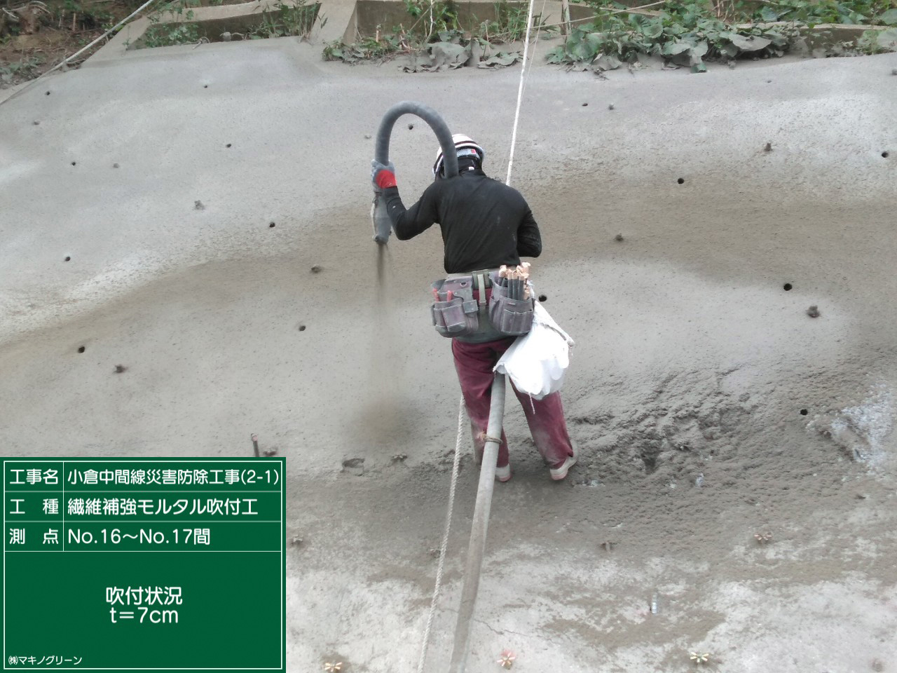 | 内容 | 老朽化した既設のモルタル吹付にせん断ボルト及び補強鉄筋等にて補強した後、繊維入りモルタル吹付工 528m2(厚み7㎝)を施工しました。 |