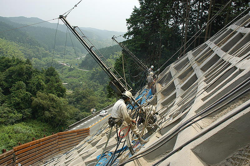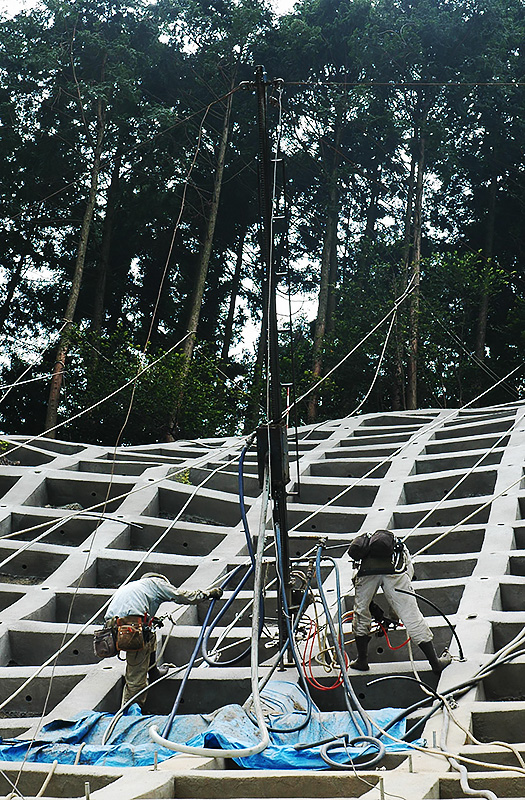 アンカー工は、高強度の鋼材を挿入して地盤との連結を強固にし、プレストレスを与えてのり面の深部までの安定を図ります。